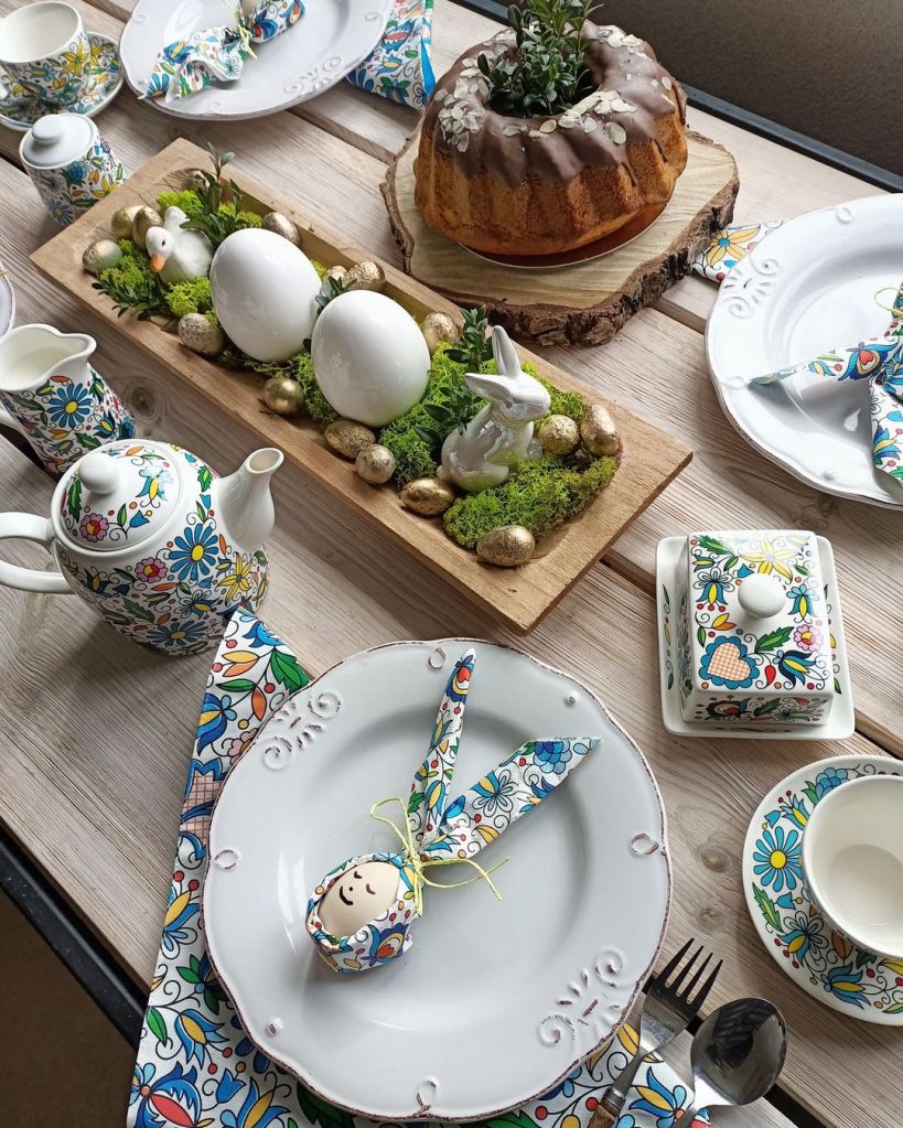 A gdzie półmisek jajek z majonezem i zielonym groszkiem, gdzie klasyczna sałatka jarzynowa, gdzie sałatka z ananasem i szynką? Oczywiście też na stole. W sąsiednim pokoju, tradycyjnie był stół pełen ciast wielkanocnych, z: