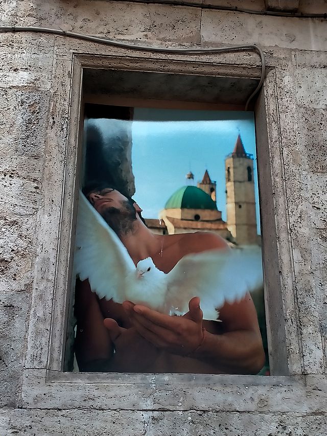 I jeszcze takie bardzo w temacie gołębicy wielkanocnej okno w pobliżu piazza Roma.