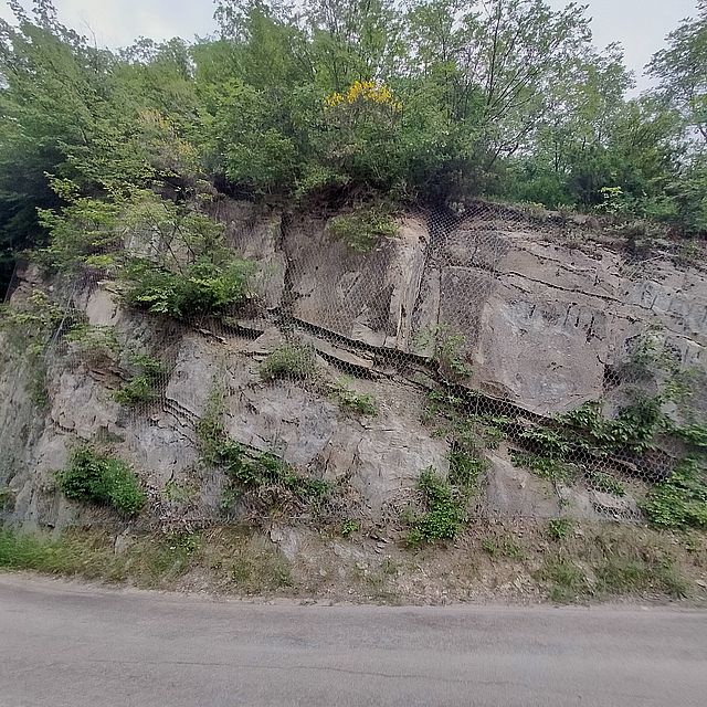Boczne kamienne urwiska przy drodze są zabezpieczone stalowymi siatkami.