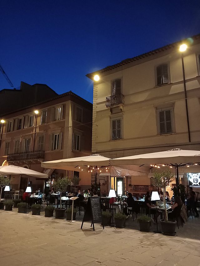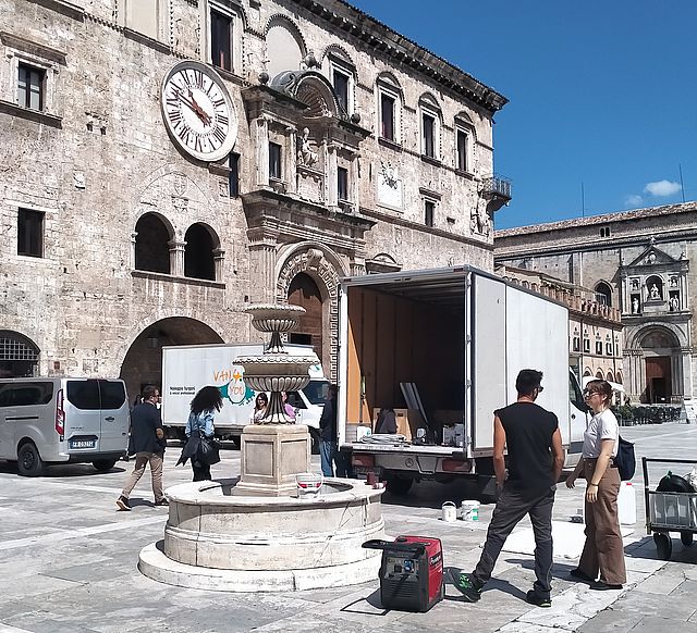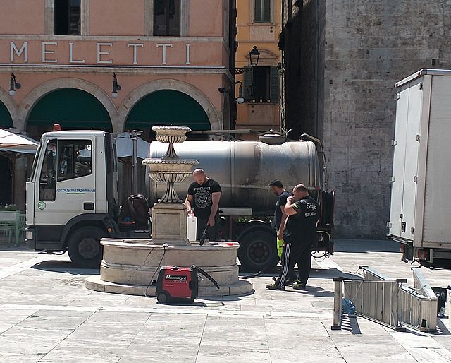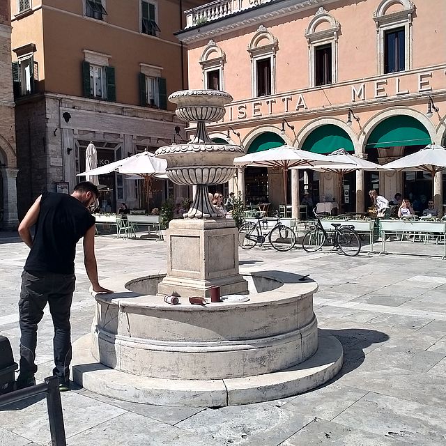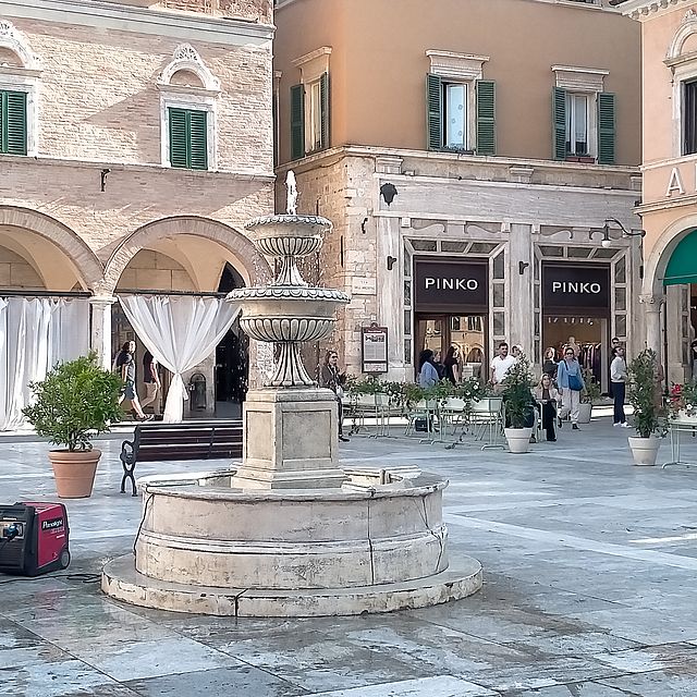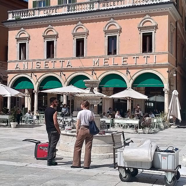 Zdążyłam posprzątać i padło hasło do wyjścia, bo V. źle się czuje w domu. To kończę wpis w cieniu na piazza del Popolo, gdzie mamy niespodziankę. Na przeciwko ” Caffe Meletti” montuje się fontanna. I słusznie. Co to za plac bez fontanny. Na piazza Artingo są dwie. Muszę uważać, bo telefon zamienia Arringo w Stringi. 😃