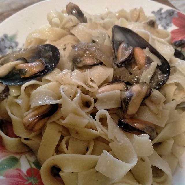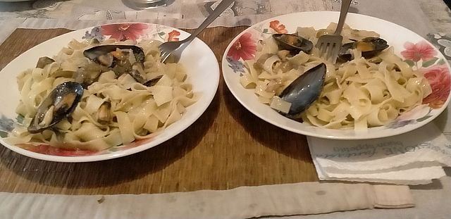 Ja pojechałam z tymi papierami , a V. gotował nasze ulubione cozze. Pyszne było, bo sugo wzbogacił smak radicchio.