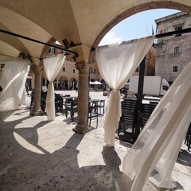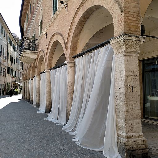 A żeby było optymistycznie. Na piazza del Popolo zawiesili prawie we wszystkich arkadach białe zasłony. Mają dawać cień i stanowić dekorację. Zawłaszcza kiedy wieje.
