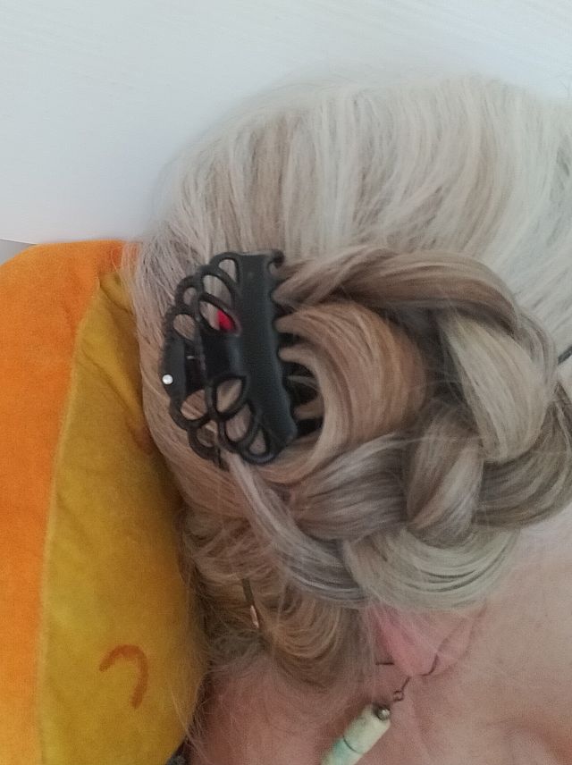 Są to etykietki do przyklejania, poza białymi i będą stanowić ratowanie moich obrusów z wypalonymi dziurami papierosowymi. Sprawdzone. Czasem żal wyrzucać dobry obrus, a dziura jest dziurą. W zamierzchłych czasach pewnie zahaftowałabym te dziurki, ale teraz mi się nie chce. Kupuję gotowe aplikacje i przyklejam na gorąco. Dodatkowo dwie klamerki do włosów. Moje upięcie spotkało się z uznaniem jednej pani. W tv włoskiej pojawiają się na przykład u Michelin Hunziker włosy splatane w warkoczowe upięcia. Mnie takie moja pani Ewa robiła sporo lat temu. 😀
