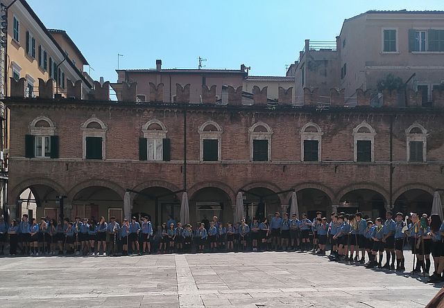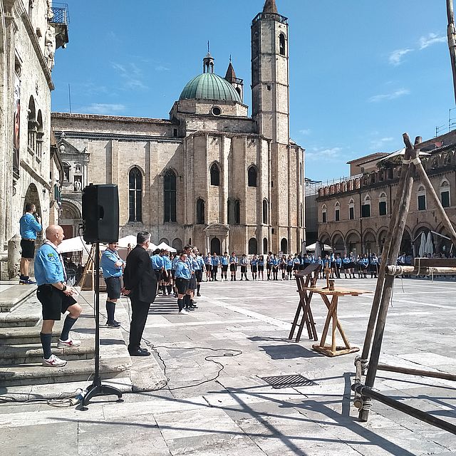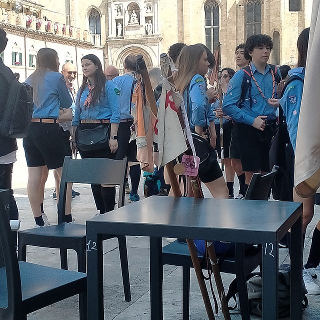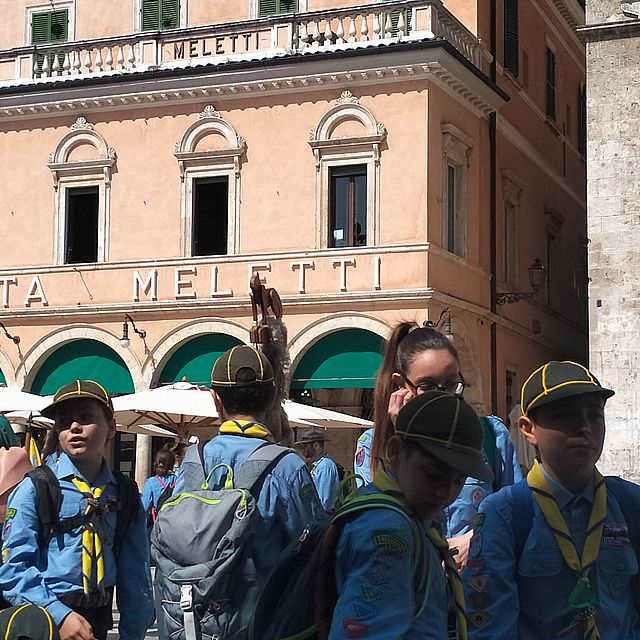 Zawsze ostatnio kiedy wychodzimy na nasze place, coś się dzieje. Dziś na piazza del Popolo zlot ( kolejny) skautów. Z przemowami i nawet obecnością ascolanskiego biskupa – kolejnego propagatora imprez kulturalnych. Widać go wszędzie. Na spotkaniach, koncernach i innych imprezach.