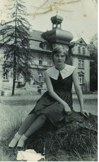 lubię z tamtego okresu. Siedzę sobie na ogromnym kamieniu na tle pałacu ( takie miejsce zdjęciowe), nóżki mam ładnie ułożone, śliczna dziewczynka – podlotek, w granatowej sukience z duuuzym białym kołnierzem. Lubię to zdjęcie do dziś, mimo, że włosy mam ostrzyżone ” na pół męsko, do pół uszu „. Nic mnie nie zeszpeciło. Sam pałac był przyjazny dla dzieci, dużo miejsca i powietrza i odkarmiano nas na potęgę. Tam zakończyłam rok szkolny z wyróżnieniem i dostałam w nagrodę książkę ” Fryckowe Lato „. Jest w domu i przypomina mi tamten czas. Ale to nie koniec wspomnień, kiedy, już jako mężatka mieszkająca na Śląsku wybrałam się zobaczyć tamto miejsce, mój mąż zgubił drogę. Zapytaliśmy przygodnie spotkaną kobietę, jak dojechać do Miedar –Kopaniny?